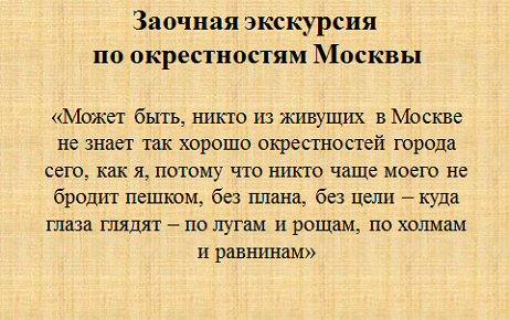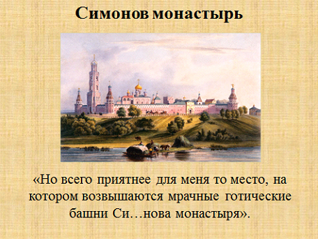 Повесть «Бедная Лиза» начинается с описания окрестностей Симонова монастыря. Мы с вами отправимся вслед за писателем на экскурсию по окрестностям Москвы. (Слайд 7)