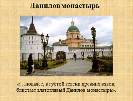 Данилов монастырь: «…подалее, в густой зелени древних вязов, блистает златоглавый Данилов монастырь» (Слайд 10)