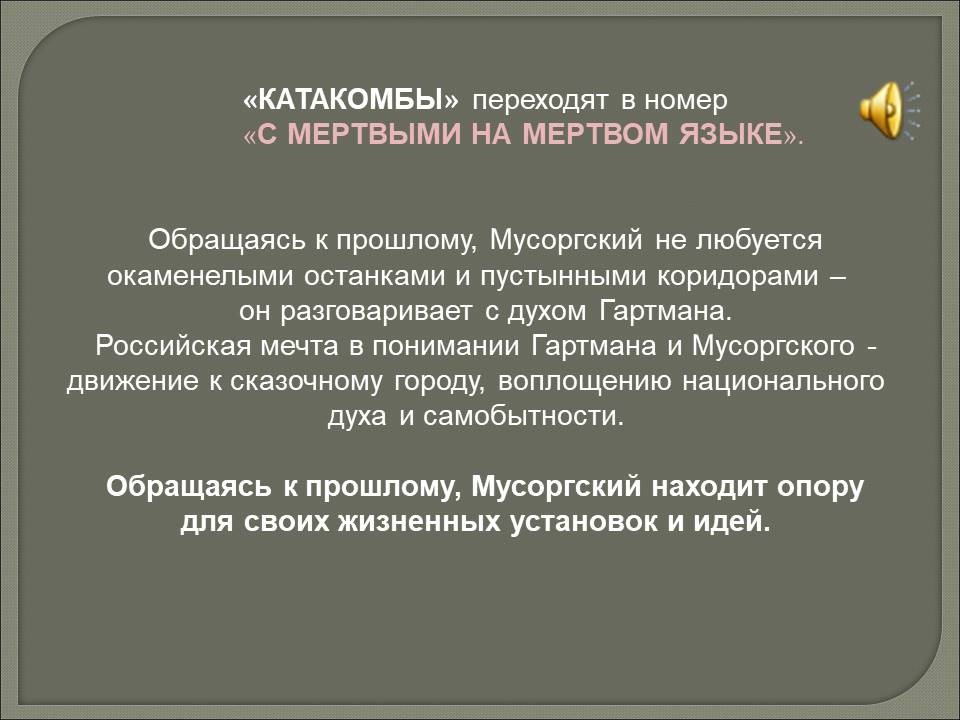 - «ПРОГУЛКА» — «С МЕРТВЫМИ НА МЕРТВОМ ЯЗЫКЕ» — «ИЗБУШКА НА КУРЬИХ НОЖКАХ» — «БОГАТЫРСКИЕ ВОРОТА (В СТОЛЬНОМ ГОРОДЕ ВО КИЕВЕ)».