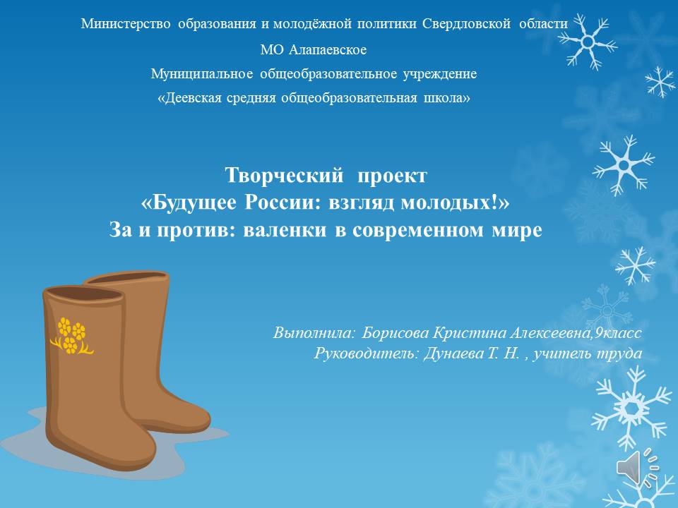 Презентация к творческому проекту "За и против: валенки в современном мире" Дунаева Татьяна, учитель труда Разделы: Технология, Руководство учебным проектом Класс: 9 Ключевые слова: групповая проектная работа Работа выполнена в форме презентации 28.10.2025
