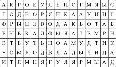 Найдите спрятанные в таблице слова и назовите сказку, в которой все эти слова встречаются. Слова могут располагаться и по горизонтали, и по вертикали.