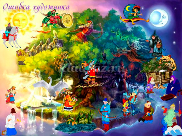 Внимательно посмотрите и найдите ошибки, которые допустил художник, изобразив не только героев из сказок А.С.Пушкина, но и героев других сказочников.