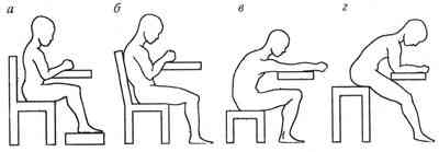 Правильное (а) и неправильное (б - г) положение тела ребенка за партой и письменным столом.