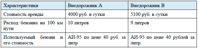 1) Клиент хочет арендовать автомобиль на трое суток для поездки протяженностью 600 км. В таблице приведены характеристики трех автомобилей и стоимость их аренды. Помимо аренды клиент обязан оплатить топливо для автомобиля на всю поездку. Какую сумму в рублях заплатит клиент за аренду и топливо, если выберет самый дешевый вариант?