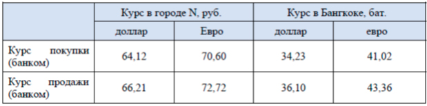 2) Федор Петрович из города N собирается поехать в Таиланд, где ему понадобится местная валюта – баты. Федор Петрович выяснил, что в городе N баты не продают, а в Таиланде не принимают и не обменивают рубли. Он решил купить доллары США или евро, а в Бангкоке, столице Таиланда, поменять их на баты. Используя данные таблицы, ответьте, в какой валюте ему выгоднее везти деньги в Таиланд – в долларах или евро? Под выгодой подразумевается возможность купить наибольшее количество батов, потратив одну и ту же сумму в рублях. В ответе укажите название валюты.
