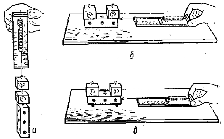 2. Измерьте вес бруска с двумя грузами при помощи динамометра. Результат измерения веса запишите в тетрадь.