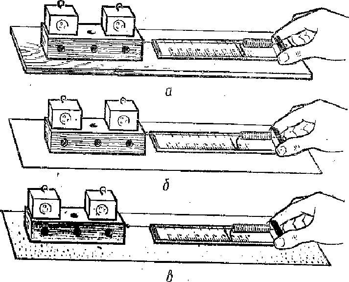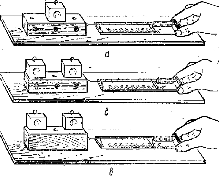 - Положите на линейку брусок меньшей гранью, поставьте на него два груза и снова измерьте силу трения скольжения бруска по линейке.