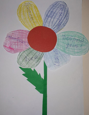 (Воспитатель усаживает детей за стол, раздает карандаши и лепестки, дети рисуют). После того, как всё готово, дети совместно с воспитателем склеивают лепестки цветка и подписывают вежливые слова по желанию детей.