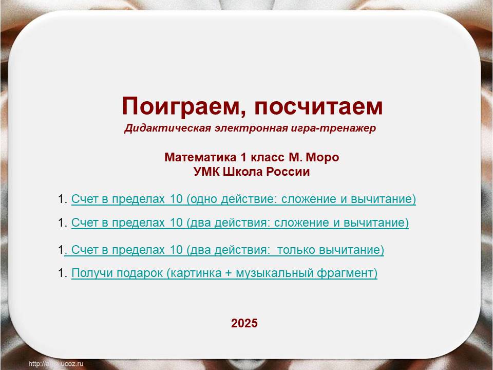 Дидактическая электронная игра-тренажер "Поиграем, посчитаем" Плотникова Наталия Валентиновна, учитель Разделы: Математика Класс: 1 Ключевые слова: математика, УМК «Школа России», счет в пределах 10, интерактивные тренажеры для устного счёта Работа выполнена в форме презентации 12.11.2025