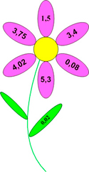 По теме в 5 классе «Десятичные дроби» используется игра «Цветочек». В листе цветка помещается дробь, которую нужно сложить, умножить, разделить, вычесть. Дроби, с которыми нужно произвести эти действия, записаны на лепестках цветка.