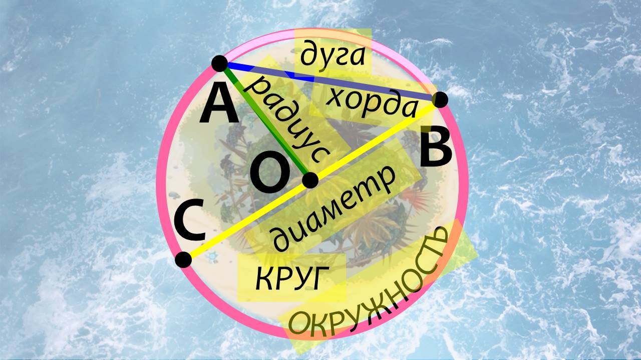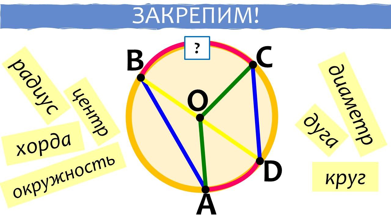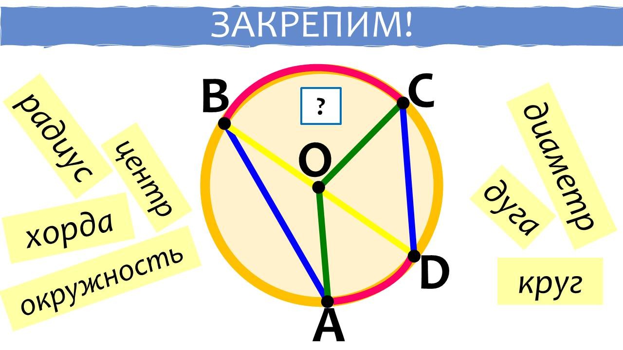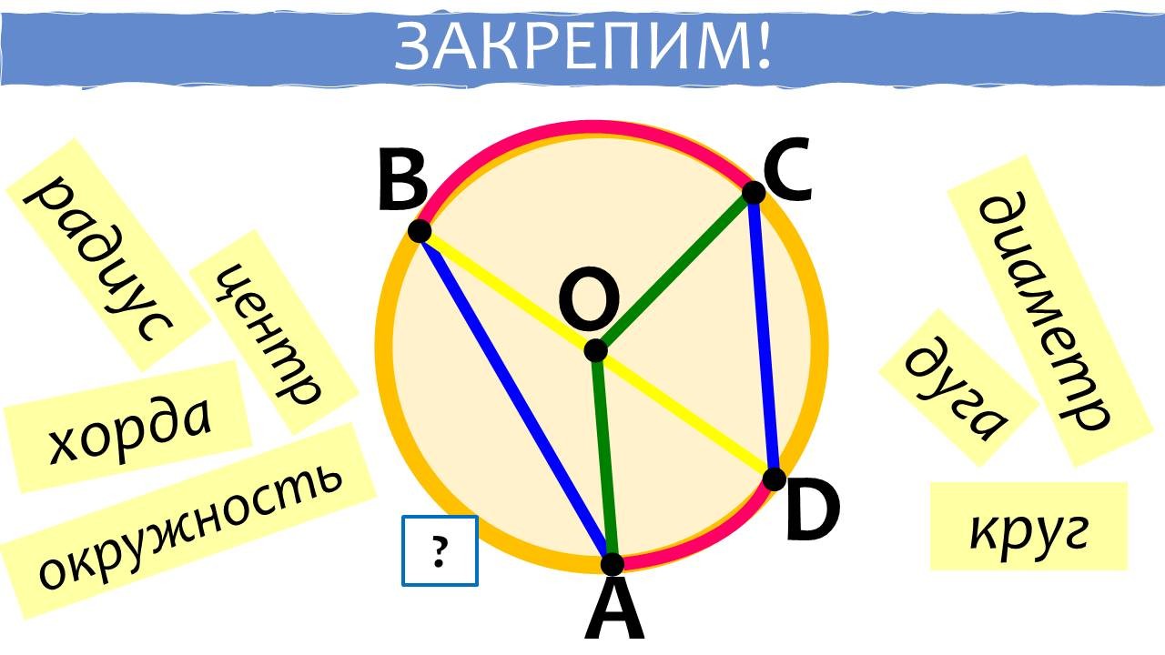 Ввести понятия: круг, окружность, радиус, диаметр, дуга, хорда.