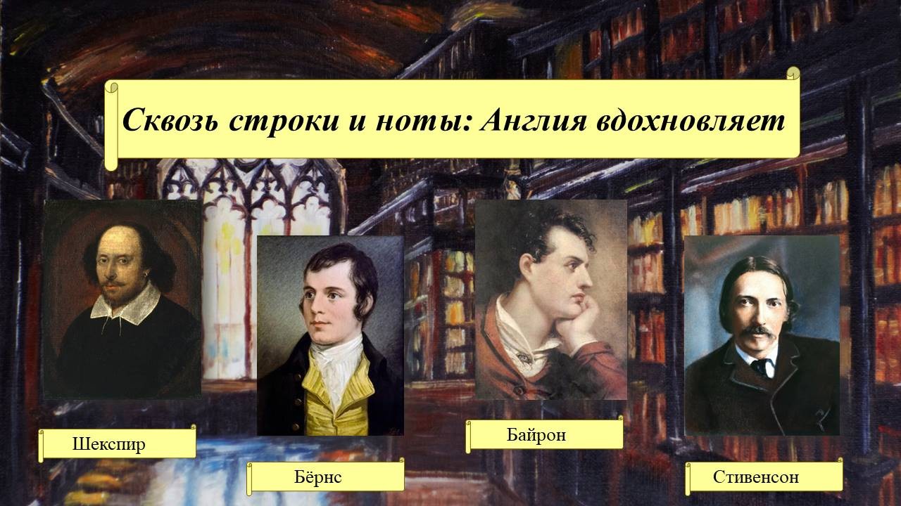 - знакомство с биографией и творчеством значимых представителей английской поэзии, таких как Уильям Шекспир, Джордж Гордон Байрон, Роберт Бёрнс, Редьярд Киплинг и др.