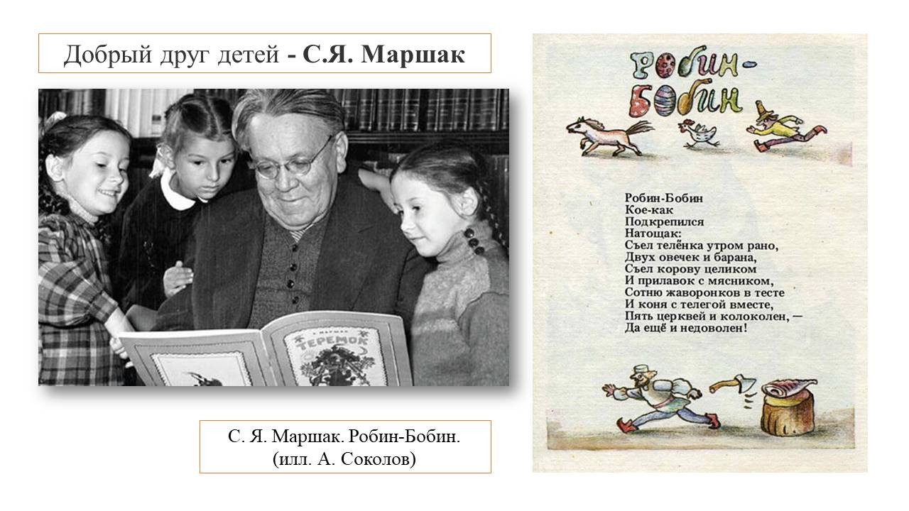 Ведущий 1: Одними из самых удачных переводов английских произведений ценители английской поэзии считают те, которые принадлежат перу Самуила Яковлевича Маршака. Его стихи – спутники детства каждого ребёнка. Знаменитый врач Сперанский, опираясь на свой многолетний опыт общения с детьми, рекомендовал прописывать малышам стихи Маршака, как один из самых надёжных «витаминов роста».