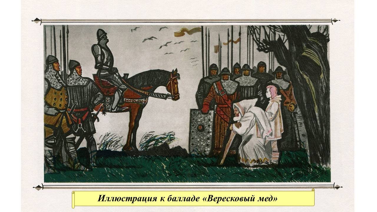 Ведущий 2: Самуил Яковлевич Маршак говорил о жанре баллады: «Я понял, что такое баллада, когда начал переводить англичан. Это разговор, короткий рассказ при встрече на улице или среди друзей в таверне, за кружкой эля. Английская народная баллада проста, естественна, как и английский детский фольклор, который я очень люблю». В своих переводах Маршак стремился передать не только поэтическое содержание баллад, самый дух их, но и особенности их формы, их музыкальную напевность.