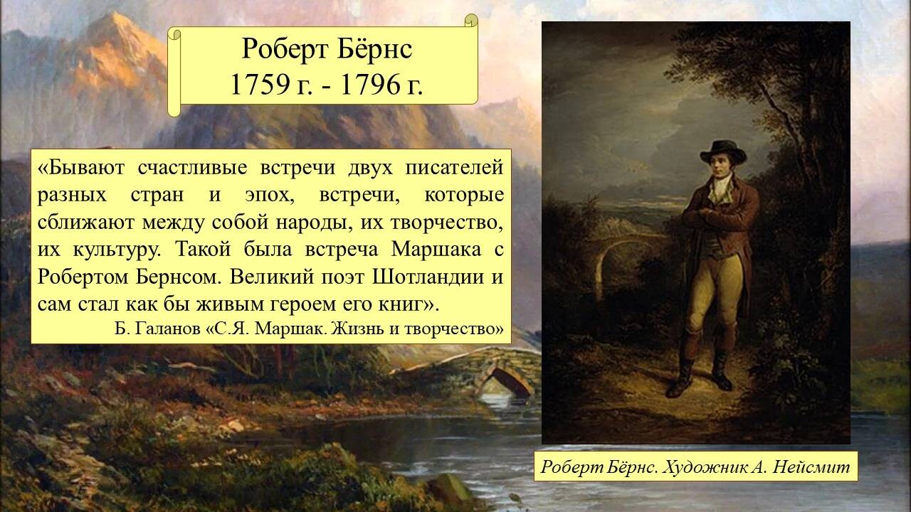 Ведущий 2: Лучшие переводы Маршака связаны с англоязычной поэзией: сонеты Шекспира, лирика Роберта Бёрнса, английские и шотландские народные баллады, стихотворения Байрона, Киплинга и других. Он считал перевод искусством, «которое призвано воспроизводить на другом языке сокровенные мысли, образы, тончайшие оттенки чувств, уже нашедшие свое предельно точное выражение на языке подлинника».