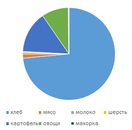 Самоотверженный труд работников сельского хозяйства в годы войны позволил бесперебойно снабжать армию и тыл продовольствием. За четыре года войны колхозное крестьянство Чувашии сдало государству больше, чем за четыре предвоенных года, хлеба – на 6086 тысяч пудов, мяса – на 121 тысячу пудов, молока - на 779 тысяч литров, шерсти – на 25 тысяч пудов, картофеля – на 1206 тысяч пудов, овощей – на 780 тысяч пудов, махорки – на 15 тысяч пудов. Построить диаграмму и ответить на вопрос, чего больше всего сдали государству?