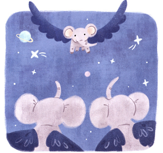 Однажды, когда малыш Элон сидел на своём холмике, мимо пролетела сверкающая звездочка. Малыш схватился своим хоботком за хвост звёздочки и …..полетел. Так он оказался на земле, среди мальчиков и девочек.