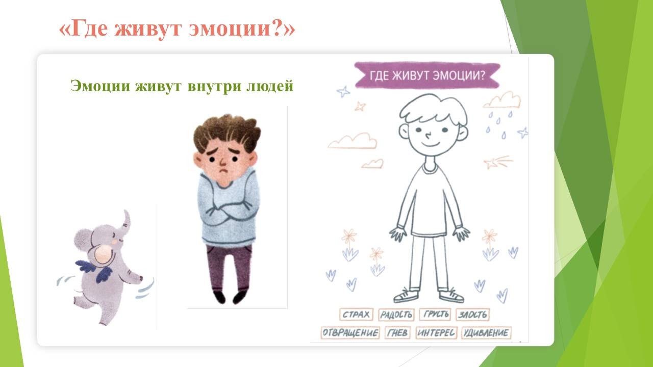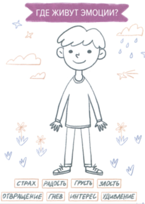 Педагог: «Эмоции живут внутри людей. Давай узнаем, где находятся твои эмоции? Нарисуй!».