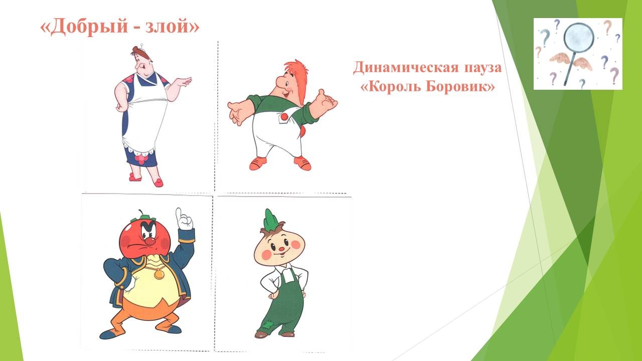 Педагог: «Назови героя и мультфильма (на слайде презентации). Определи доброго и злого героя».