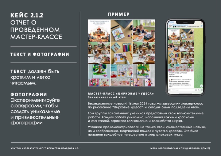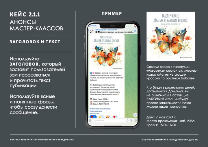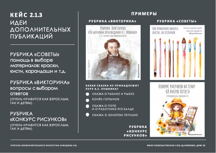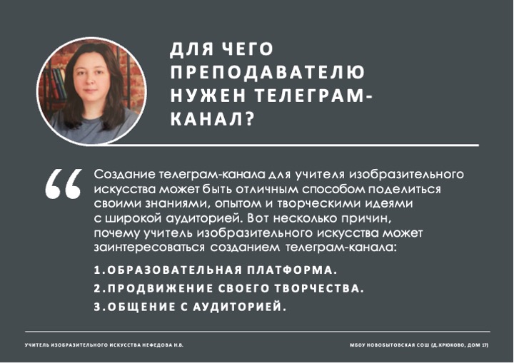 Учитель может использовать канал для демонстрации и продвижения своих работ, выставок, проектов, а также для привлечения новых учеников, например, кружки ПФДО.
