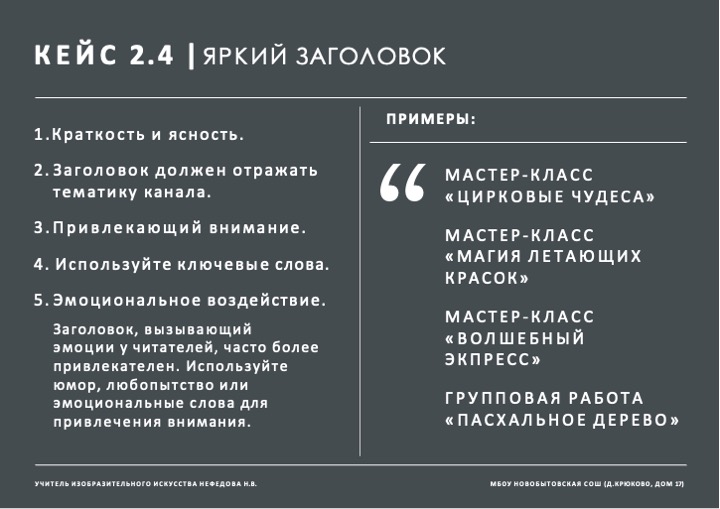 Пользователи должны сразу понимать, о чем ваш канал. Подбирайте заголовок, который отражает основную тему или направление вашего контента.