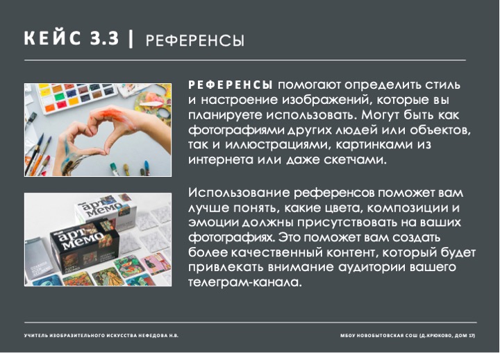 Таким образом, референсы при съемке фото для телеграмм-канала являются важным инструментом, который поможет вам создать качественный и привлекательный контент для вашей аудитории.