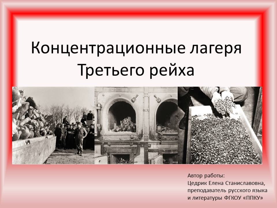 Презентация к классному часу "Концентрационные лагеря Третьего рейха" Цедрик Елена Станиславовна, преподаватель русского языка и литературы ФГКОУ «ППКУ» Разделы: Классное руководство, Великая Отечественная война: взгляд сквозь время Классы: 8, 9 Ключевые слова: Великая Отечественная война 1941-1945 гг. Работа выполнена в форме презентации 3.12.2025