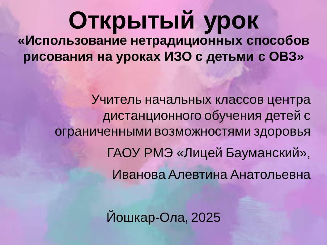 Использование нетрадиционных способов рисования на уроках ИЗО с детьми с ОВЗ Иванова Алевтина Анатольевна, начальных классов центра Разделы: Начальная школа, МХК и ИЗО Класс: 4 Ключевые слова: ОВЗ, нетрадиционные техники рисования Работа выполнена в форме презентации 4.12.2025
