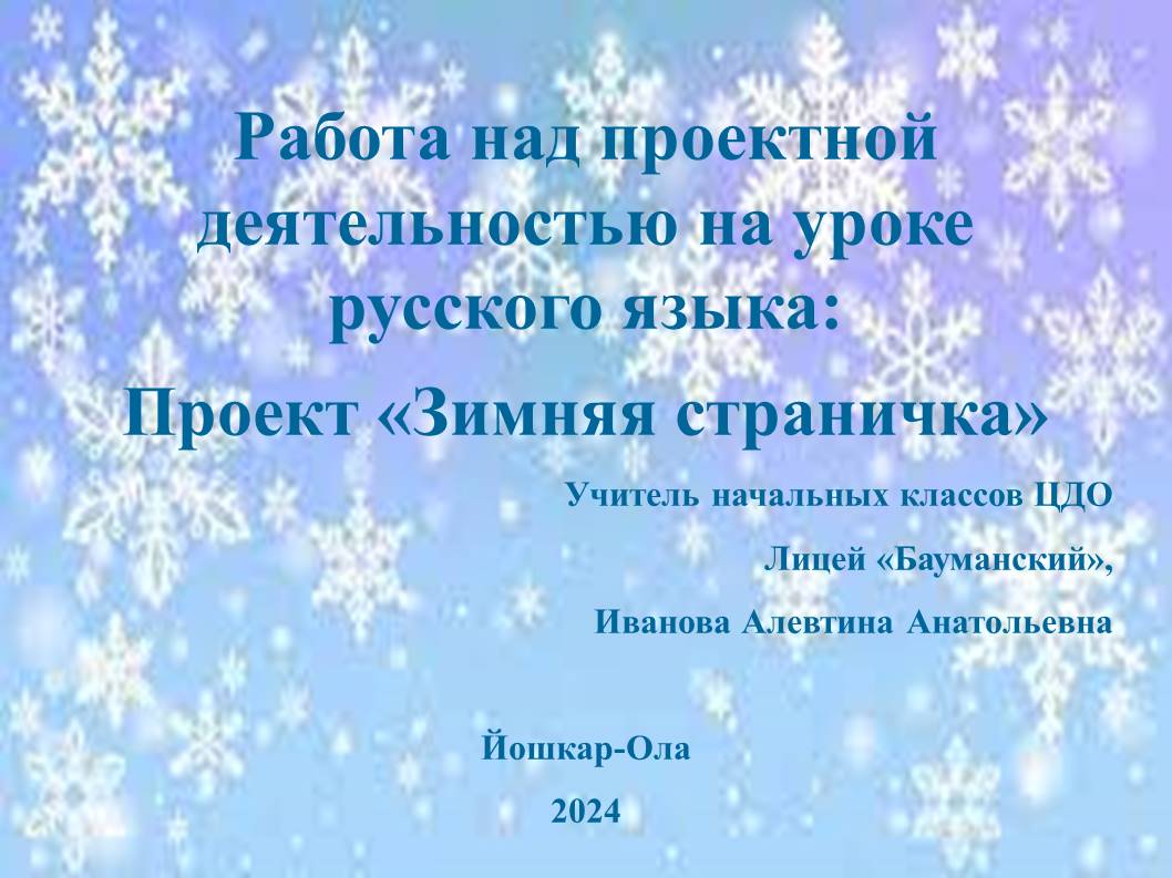 Работа над проектной деятельностью на уроке русского языка. Проект: "Зимняя страничка" Иванова Алевтина Анатольевна, начальных классов центра Разделы: Русский язык, Начальная школа Класс: 3 Ключевые слова: проектная деятельность Работа выполнена в форме презентации 4.12.2025