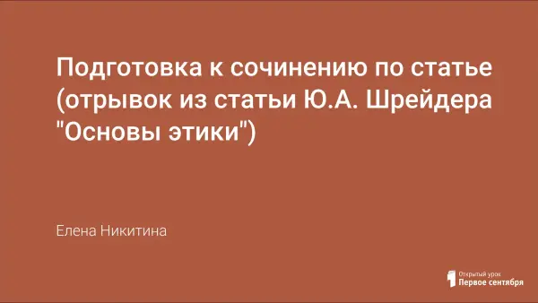 Цель урока: научить писать сочинение-рассуждение. На занятии идет подготовка к сочинению по отрывку из статьи Ю.Шрейдера «Основы этики». Содержание урока построено таким образом, что учащиеся, знакомясь с презентацией, повторяют теорию и, используя речевые обороты, определяют проблему, комментируют авторскую позицию, аргументируют свое мнение и формулируют заключение будущей работы.