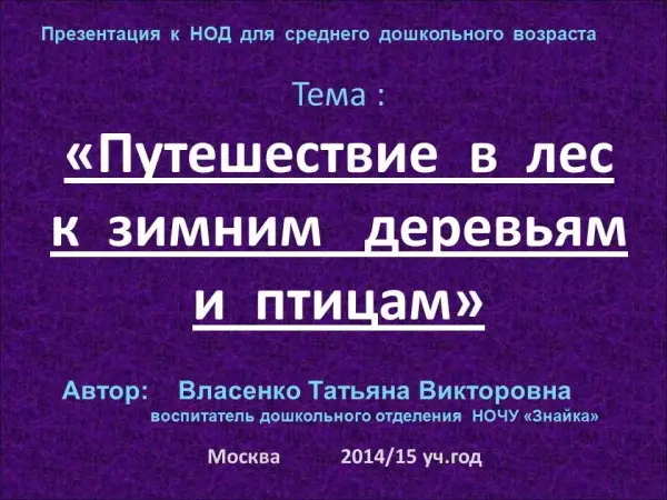 Занятие в доступной, наглядной форме знакомит детей с экосистемой «лес», расширяет, систематизирует и обобщает представления детей о признаках зимы, об образе жизни лиственных и хвойных деревьев зимой, зимующих птицах; пробуждает интерес к природе, формирует основы экологических представлений. Презентация к занятию обеспечивает наглядность и систематизирует представления детей.