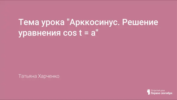 Цели урока: обеспечить усвоение и понимание понятия арккосинуса; вывести общую формулу решения уравнения <span class="math">cos t = a</span>; обеспечить отработку умения применять алгоритм решения данного уравнения.