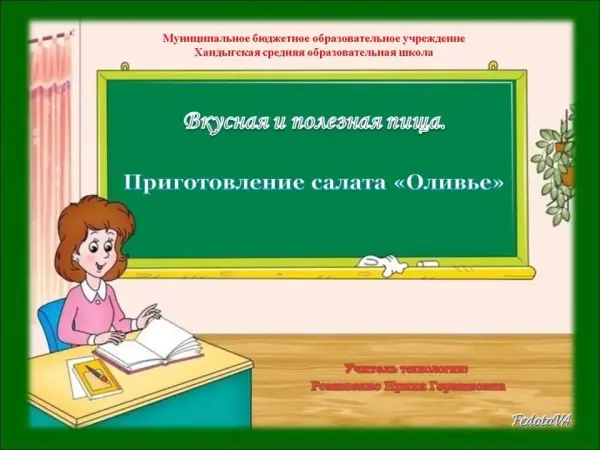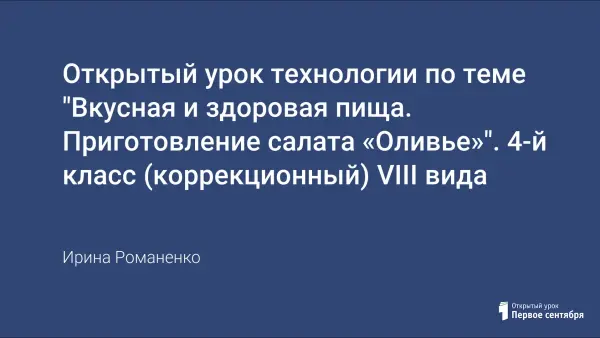 Урок рассчитан на 2 часа, где один час ‒ объяснение нового материала, второй – практическая работа: приготовление салата «Оливье». Цель коррекционно-воспитательной работы: настроить учащихся на работу, расширить знания, развить умение анализировать свою деятельность, научить аккуратно, правильно нарезать овощи, навыкам созидания и самореализации, прививать интерес к оформлению салатов, закрепить практические навыки.