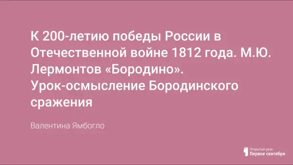 К 200-летию победы России в Отечественной войне 1812 года проводится урок-осмысление Бородинского сражения. Цель: анализируя произведение М.Ю. Лермонтова «Бородино», рассказать о безмерной любви к Отчизне, самоотдаче, желании солдат защитить родную землю от вторжения иноземных захватчиков; развивать чувства патриотизма, собственного достоинства, навыки чтения стихотворения и умение высказывать свое мнение о прочитанном.