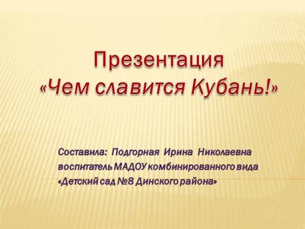 Интегрированное занятие в подготовительной группе обобщает знания детей о родном крае (люди, природа, пшеница, рис, чай, сахарная свекла, виноград, фрукты, овощи, ягоды, подсолнечник), знакомит со стихотворением «Кубань моя!» кубанской поэтессы Светланы Донченко, формирует навыки работы с гофрированной бумагой, клеем-карандашом, пластилином, семенами подсолнуха.