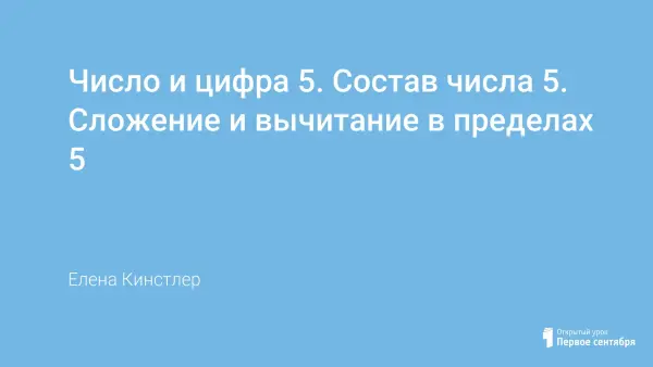 Цель урока: изучить число 5, его состав, написание цифры 5; развивать мышление, математические способности, внимание, память, речь. Учащиеся научатся определять место числа в натуральном ряду, состав числа 5; соотносить цифру и число; образовывать следующее число прибавлением числа 1 к предыдущему числу или вычитанием числа 1 из следующего числа; слушать собеседника и вести диалог; слушать учителя.