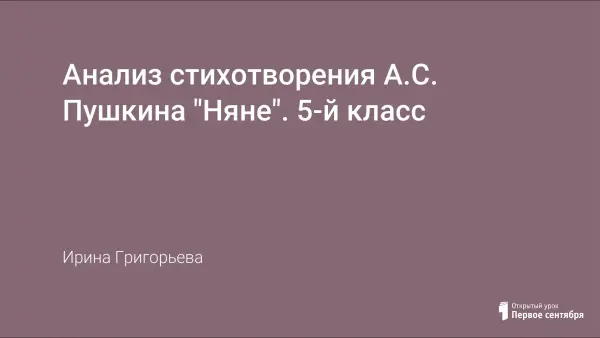 В ходе урока учащиеся знакомятся со стихотворением «Няне», с некоторыми фактами биографии поэта, слушают стихотворение в исполнении актера, работают с толковыми словарями, учебником; повторяют сведения об изобразительно-выразительных средствах (эпитет, метафора, сравнение), знакомятся с перифразом. Навыки анализа стихотворного текста совершенствуются системой вопросов.