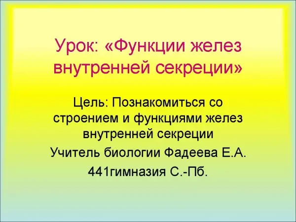 Урок знакомит учащихся со строением и функциями желез внутренней секреции, учит распознавать симптомы эндокринных заболеваний.