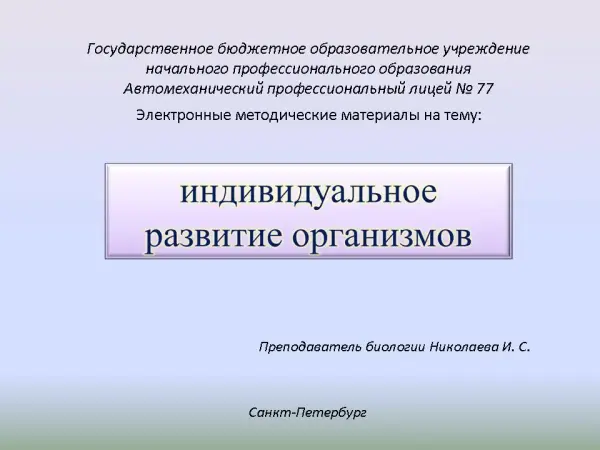 Урок-лекция проводится для учащихся 1-го курса НПО, рекомендован для базового курса общей биологии при изучении раздела «Организм». Форма урока: медиа-лекция, развивает критическое мышление по схеме «вызов – осмысление – размышление».