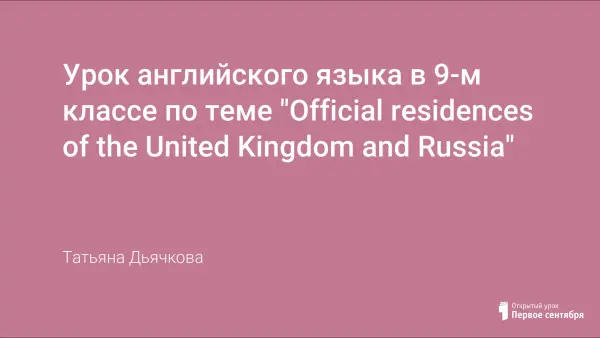 Урок английского языка «Official Residences of the United Kingdom and Russia» для 9-го класса построен с опорой на УМК «Spotlight». Урок содержит страноведческий материал Модуля 2/ Culture Corner 2 и имеет в основе технологию проблемного диалога. Цель урока – развитие социокультурной компетенции как составляющей коммуникативной компетенции и духовно-нравственного воспитания личности. Урок нацелен на выявление общих черт и различий между резиденциями глав государства России и Соединённого Королевства.