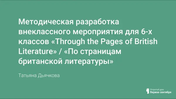 Внеклассное мероприятие по английскому языку «Through the Pages of British Literature» предназначено для учащихся 6-х классов и проводится в форме игры-соревнования. Мероприятие нацелено на повышение мотивации к изучению британской литературы, расширение читательского кругозора учащихся. Игра состоит из семи заданий, в ходе выполнения которых учащиеся тренируют навыки аудирования и чтения, знакомятся с известными британскими писателями и их популярными произведениями.