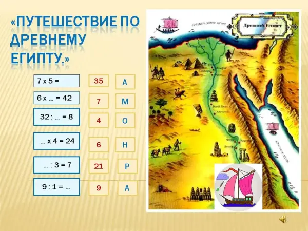 Урок повторения проводится в форме игры-путешествия по Древнему Египту, обобщает знания учеников по теме. Развивает коммуникативные навыки, умение излагать свою точку зрения, пересказывать информацию, выделять главное, ориентироваться в основных событиях истории Древнего Египта.