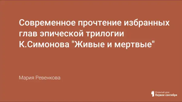Автор ставит следующие задачи: познакомить старшеклассников с романом «Живые и мёртвые», развивать навыки работы с текстом художественного произведения, что формирует умение мыслить аналитически. Работа включает в себя краткий обзор всех книг эпической трилогии, даёт трактовку смысла заглавия произведения и особенностей жанра, а также предлагает один из вариантов анализа избранных глав.