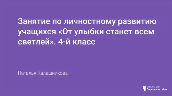 Цель занятия по личностному развитию учащихся начальных классов: формирование эмоциональных реакций, которые помогут воспитанникам адаптироваться в социуме, ощутить успех или поражение, почувствовать состояние другого и понять его. Воспитанники знакомятся с различными внешними проявлениями настроения и со способами управления своим настроением; воспитывается дружелюбное отношение к окружающим людям.