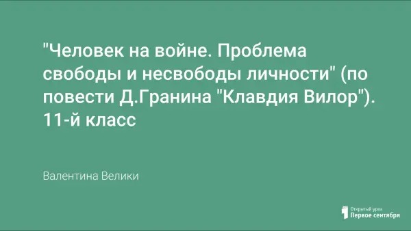 Урок литературы по программе Т.Ф. Курдюмовой, проведен как открытое мероприятие в школе. Цель: формирование представления о проблеме «человек на войне» в литературе 50–70-х годов, в военной повести Даниила Гранина «Клавдия Вилор», чувства патриотизма и гражданской ответственности.