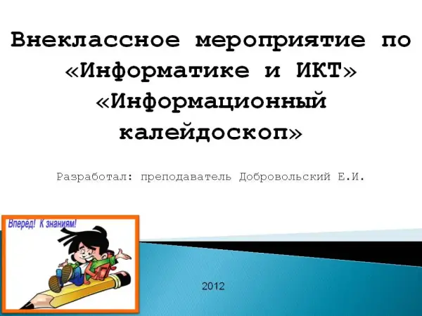 На мероприятии каждый член команды работает за компьютером, от этого зависит успех всей команды. Цель внеклассного мероприятия: повышение мотивации к изучению предмета «Информатика и ИКТ», познавательной активности, освоение правильной предметной терминологии, повторение и закрепление материала, представленного в неординарных ситуациях.