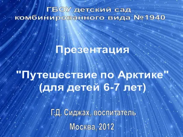 Презентация для детей 6–7 лет содержит 55 слайдов, рассчитана на комплекс НОД: «Здравствуй, Арктика», «Что такое снег?», «Обитатели Арктики», «Люди в Арктике». Демонстрацию презентации сопровождают аудиофрагменты (звуки природы; голоса животных и птиц). Поисходит частая смена деятельности детей.