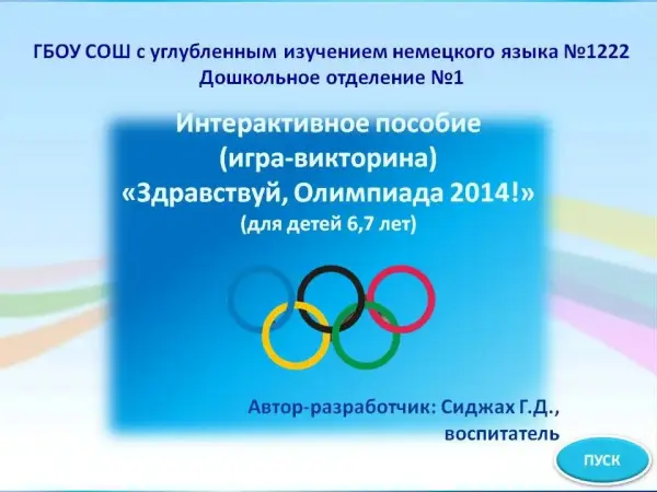 Интерактивное пособие представляет собой задания для детей 6−7 лет в форме викторины. Развивает познавательно-поисковую активность, повышает интерес и желание детей к занятиям спортом. Учтены принципы доступности, наглядности, целостности, выбора, интеграции образовательных областей, вариативности заданий. Игра может быть проведена с группами детей, а также индивидуально.