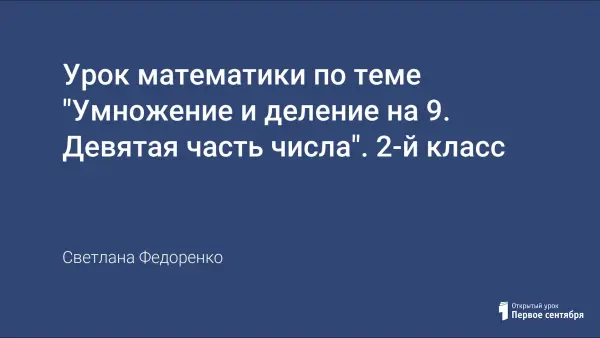 Урок математики во 2-м классе (УМК «Начальная школа XXI века») направлен на закрепление умения находить девятую часть числа; совершенствование вычислительных навыков; закрепление знаний табличных случаев умножения и деления; развитие внимания и умения рассуждать, анализировать и обобщать.