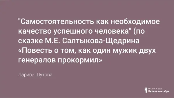 Урок по сказке М.Е. Салтыкова-Щедрина «Повесть о том, как один мужик двух генералов прокормил» проводился в 7-м классе учебного заведения закрытого типа, где обучаются только мальчики, и построен с учетом гендерного подхода и на основе метапредметности. На уроке применена технология развития креативного мышления (метод шести шляп Эдварда де Боно), элементы занимательности, групповые и индивидуальные формы работы, дифференцированное задание.